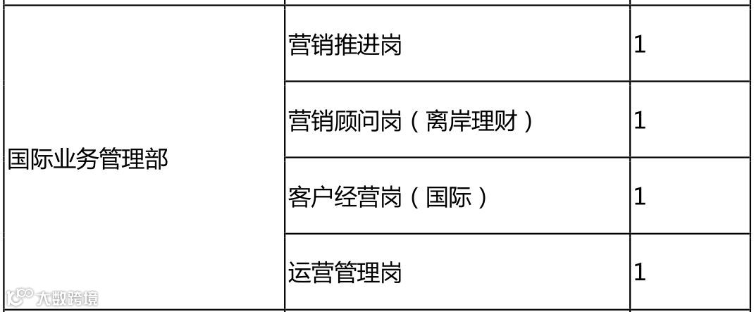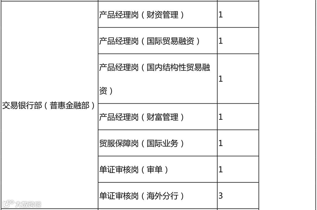 应聘条件:35 周岁以下;经济、会计、外语、数学等专业全日制本科及以上学历;2年以上银行或相关行业工作经验,有银行国际业务或同业业务工作经验或总行层面运营、清算工作经验者优先;具有会计基础知识,熟悉银行财务报表和 IT 系统;具有较强的沟通能力、良好的书面表达能力和清晰的逻辑思维能力;英语流利。