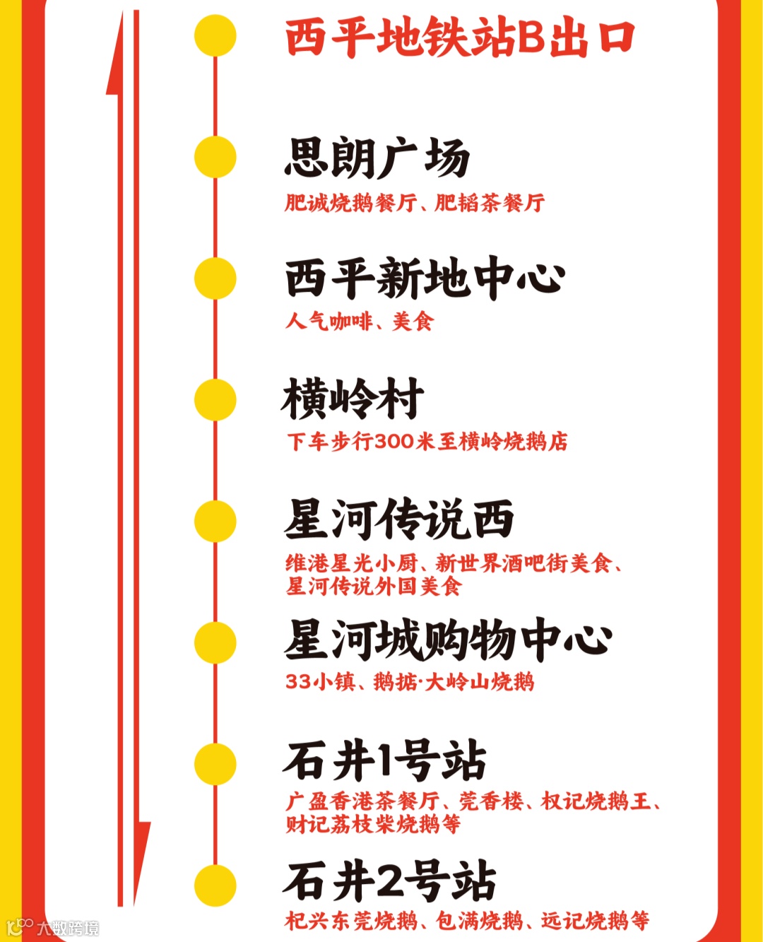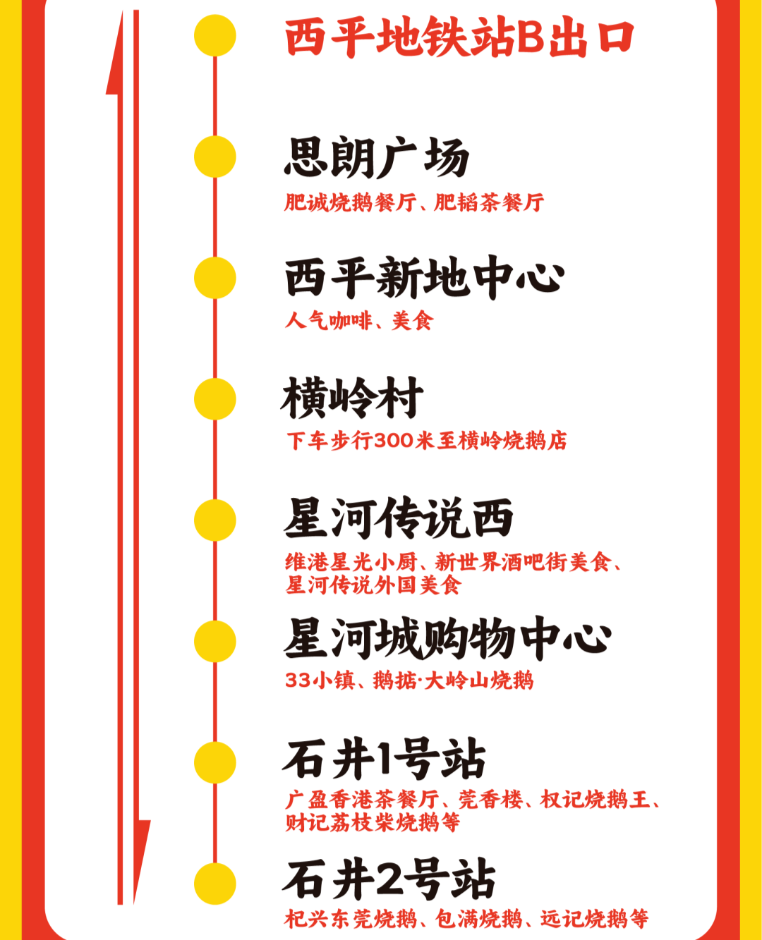 西平地铁站B出口、思朗广场、西平新地中心、横岭村、星河传说西、星河城购物中心、石井1号站、石井2号站