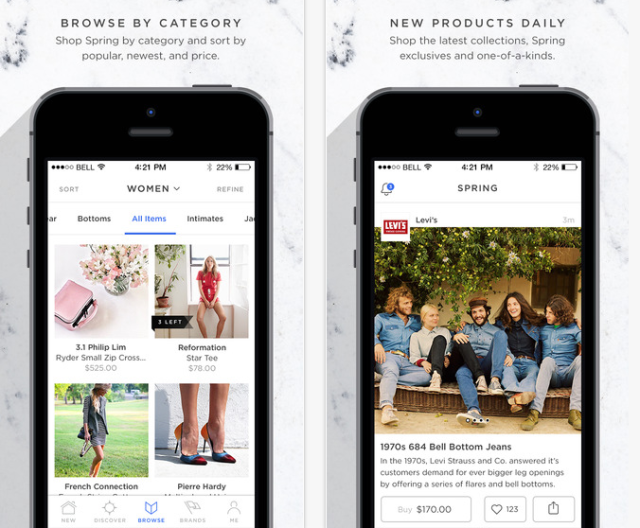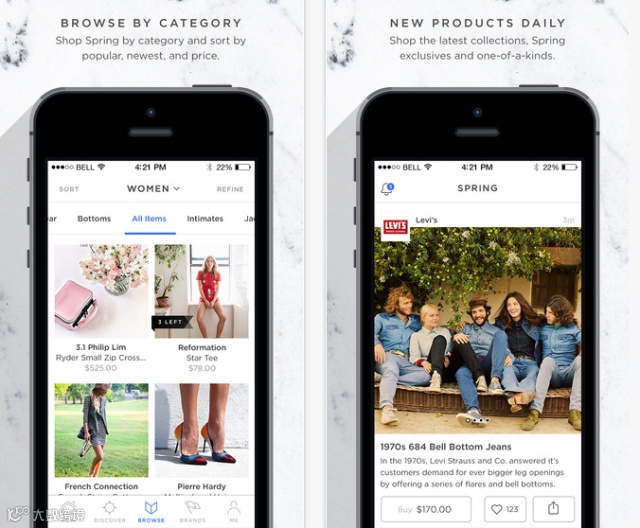 是否因为选择太多而厌倦疲劳的网上购物?太多商品看不过来,支付经常被取消,又或者被许多根本不是自己style的商品占用时间……一款彻底改变你网购生活的应用Spring或许是最好的选择。Instagram风格的商品陈列,当季精选的最佳单品,再加上一键下单的极速支付都是Spring带来的最新购物体验。这家成立于8月中旬的创业公司初期得益于时尚巨头LVMH集团的投资,短短几个月内发展了强大的用户群,它就像一个图片分享型的社交网站,一旦你看到喜欢的商品就可以迅速下单。