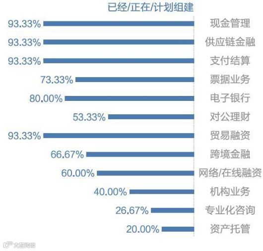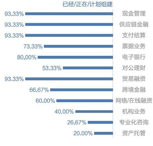 为适应企业综合化、定制化产品需求的不断提升,商业银行在组建交易银行的过程中,需要对现有业务条线进行梳理。截至2017年底,不管是否组建交易银行,现金管理都成为加深银企关系的重要基石,是商业银行的核心业务,也是未来业务条线发展的重中之重(交易银行和非交易银行的占比分别为93.33%,83.33%)。同样纳入到交易银行重点业务范畴的还有支付结算(占比93.33%)和供应链金融(占比93.33%)。在交易银行的框架下,现金管理是核心业务,支付结算是产品创新基础,供应链金融是业务和产品如何嵌入到企业经营的体现,三者共同搭建交易银行业务的架构,是交易银行多产品条线综合服务的核心。