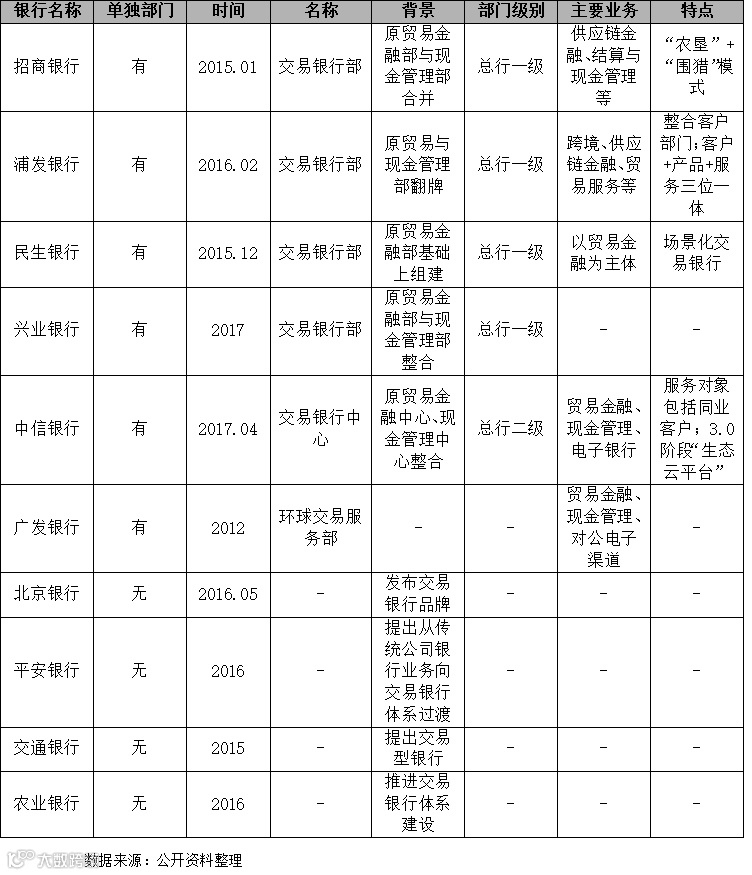目前单独成立交易银行部门或中心的五家股份行中,四家是将原来的贸易金融部门和现金管理部门进行整合,民生银行是在原贸易金融部门的基础上组建。其中浦发银行在成立交易银行之前,先将两个部门合并为贸易与现金管理部,在整体翻牌。中信银行则是在组织架构层面调整之前,先把产品、系统、品牌进行整合。