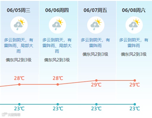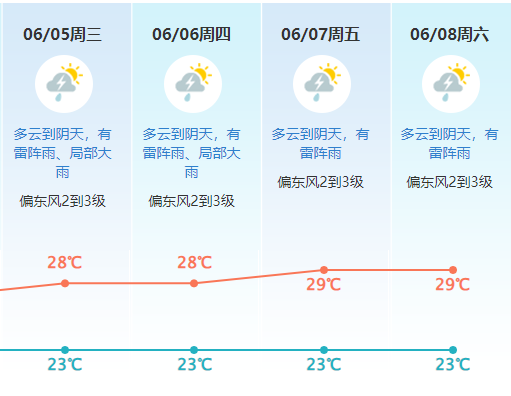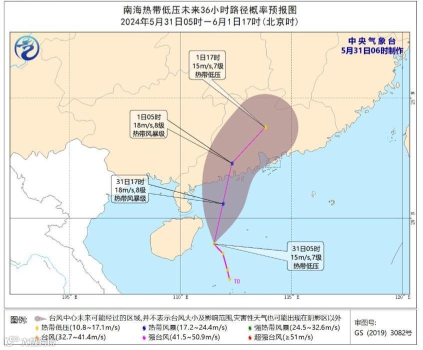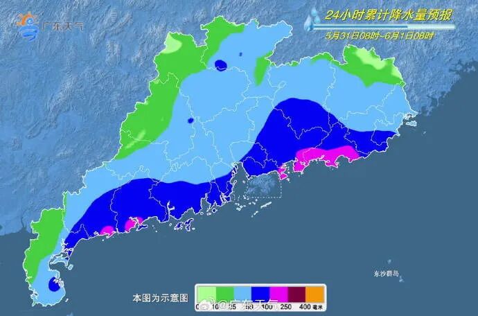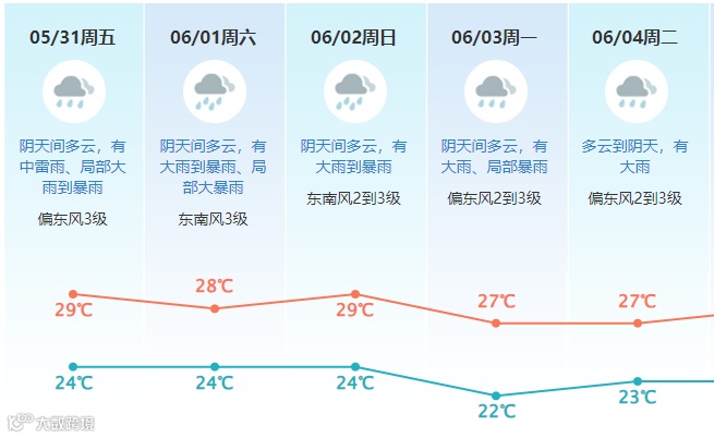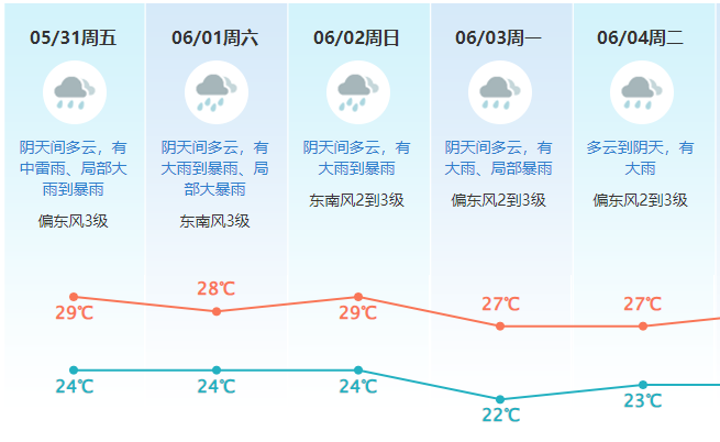其中,5月31日-6月2日受季风低压环流气流影响,预计有暴雨到大暴雨,最大时雨强40-70毫米,三天累积降水120-200毫米、局部250毫米或以上,并伴有6-7级、沿海及高地8级阵风,主要降水时段在31日夜间至1日夜间。