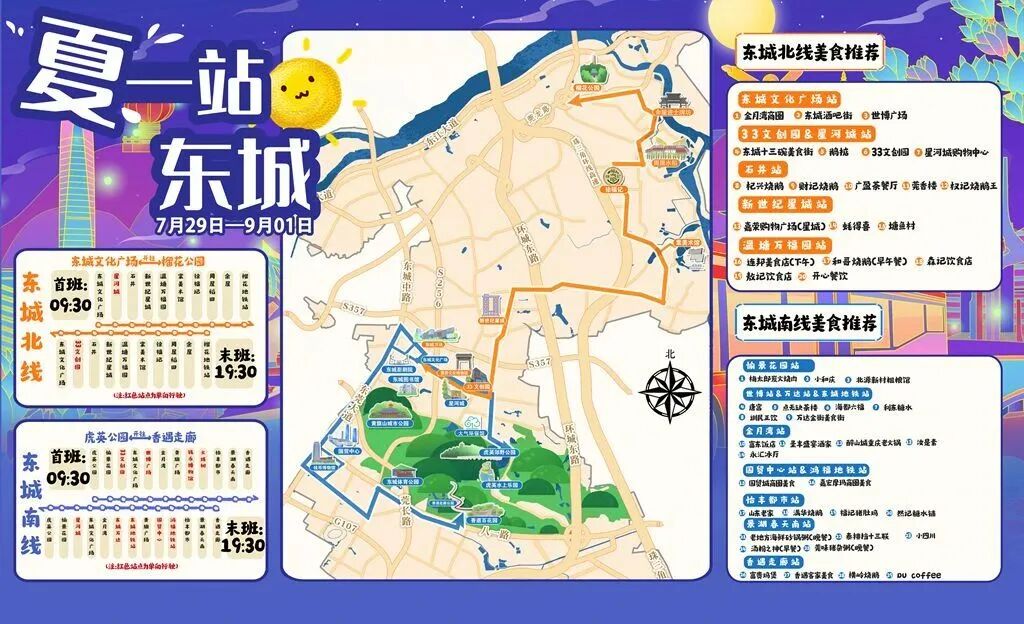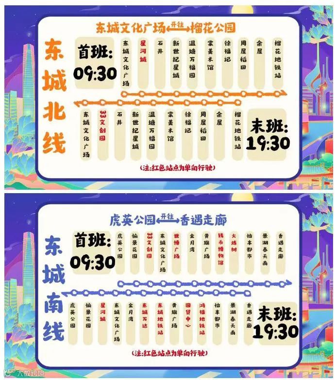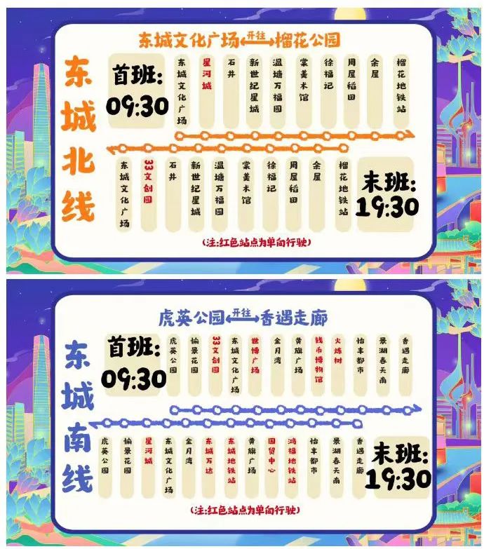 东城南线线路首发站为虎英公园,终点站是香遇走廊,单程约12公里。途经愉景花园、33文创园、黄旗广场、钱币博物馆等12个站点。