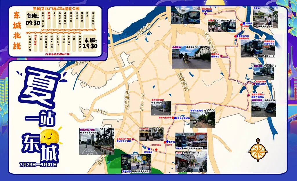 东城北线线路首发站为东城文化广场,终点站是榴花地铁站,单程约16公里,途经星河城、石井、棠美术馆、徐福记、周屋稻田、余屋等10个站点。