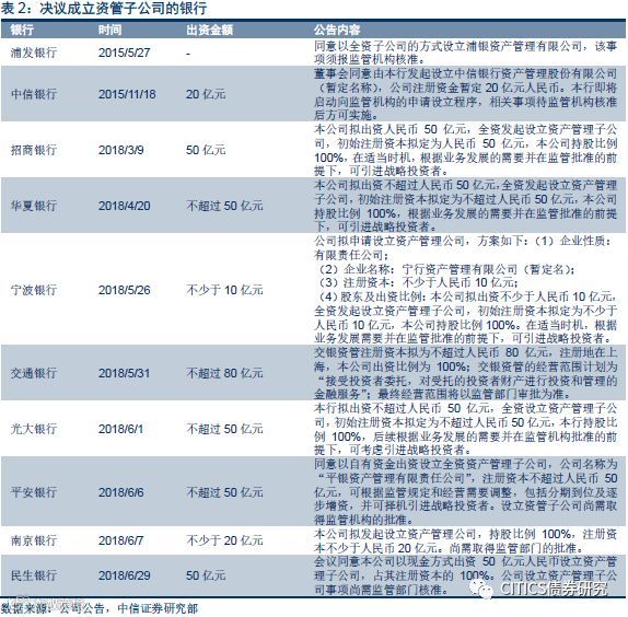 银行资管作为银行的表外义务,蕴藏着很多风险隐患。监管此举主要是为了隔离银行表内外风险,同时也标志着银行逐渐由资金委托方转向资金管理方的时代已经开始。早在2015年,浦发银行就通过了设立资产管理子公司的决议,中信银行紧随其后。随着资管新规(征求意见稿)的出台,招商银行、华夏银行等纷纷决议出资设立资产管理子公司。各商业银行出资金额基本都为50亿元,交通银行则为首家设立资管子公司的国有大行,出资额高达80亿元。