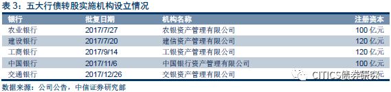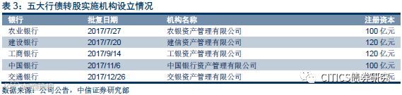 2017年8月1日,国家发改委办公厅印发《关于发挥政府出资产业投资基金引导作用推进市场化银行债权转股权相关工作的通知》,鼓励社会资本参与市场化债转股,以减轻资金成本压力。同时,2017年,五大国有银行纷纷响应国务院和发改委的号召,陆续设立了资产管理公司作为债转股实施机构。