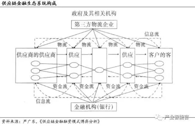 供应链金融是对供应链的某个环节或全链条提供定制化的金融服务,通过整合信息、资金、物流等资源,达到提高资金使用效率、为各方创造价值和降低风险的作用。这种服务穿插在交易过程中,其主要模式是以核心企业的上下游为服务对象,依托高信用优势广开门路获得廉价资金,通过相对有效的征信系统和完善的风险防范措施,向产业链上下游客户提供融资服务,获得新利润增长点,构建更紧密的产业链生态系统。
