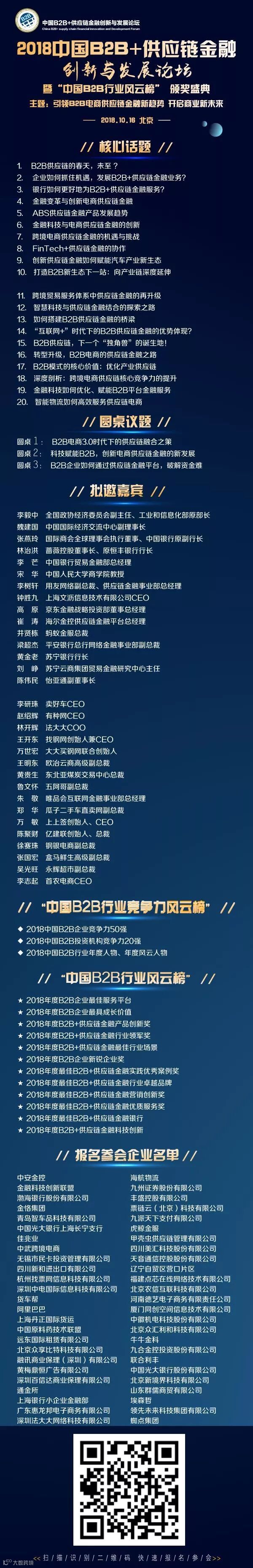 2018中国B2B+供应链金融创新与发展论坛,意在探讨、深度解读2018年,我们如何建设跨境B2B金融的发展?如何打造互联网产业链金融生态圈?如何创新与发展B2B+供应链金融平台?跨境电商供应链服务创新模式?如何驱动电商供应链金融?智能物流如何高效服务跨境电商?这些问题都将在“2018中国B2B+供应链金融创新与发展论坛”上找到答案。