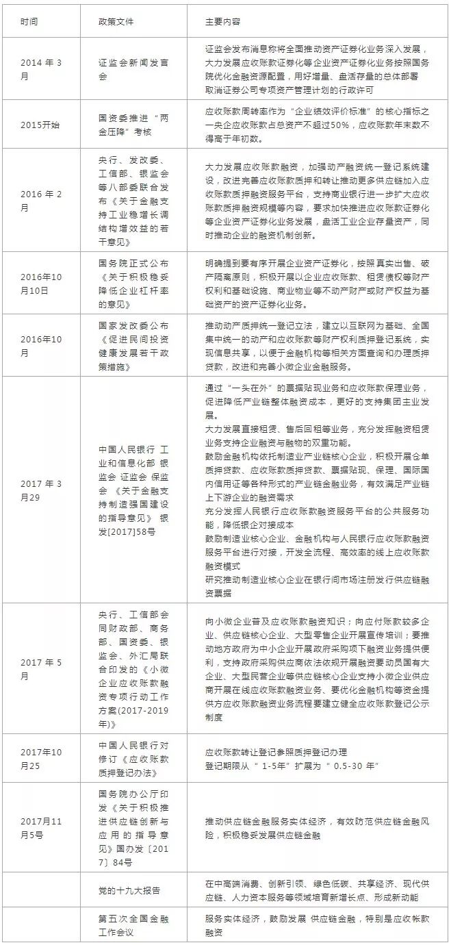在如今我国经济增长放缓之期,盘活巨额存量应收账款、提高企业资金使用效率,改善企业财务结构对于经济结构转型意义重大,为此党中央和国务院近几年接连发文推动供应链融资,推进更多供应链企业加入收账款质押融资服务平台,建立应收账款交易机制;推动大企业和政府采购主体积极确认应收账款,帮助中小企业供应商降低融资成本;推进应收账款证券化资产证券化,盘活存量资产。