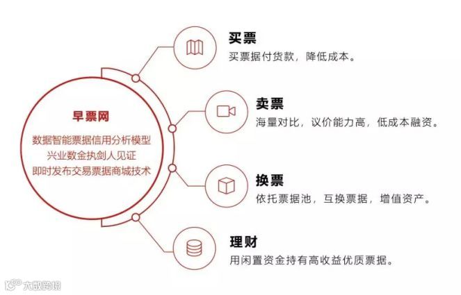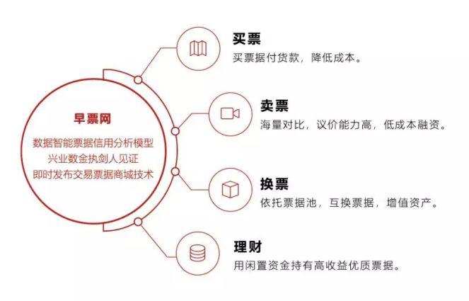 早票网(www.zaopiaowang.com)是一家撮合电子承兑汇票交易的金融科技服务平台,企业随时自主发布票据买卖需求,即时议价、即时交易,同时由兴业数金“执剑人”保障交易安全。