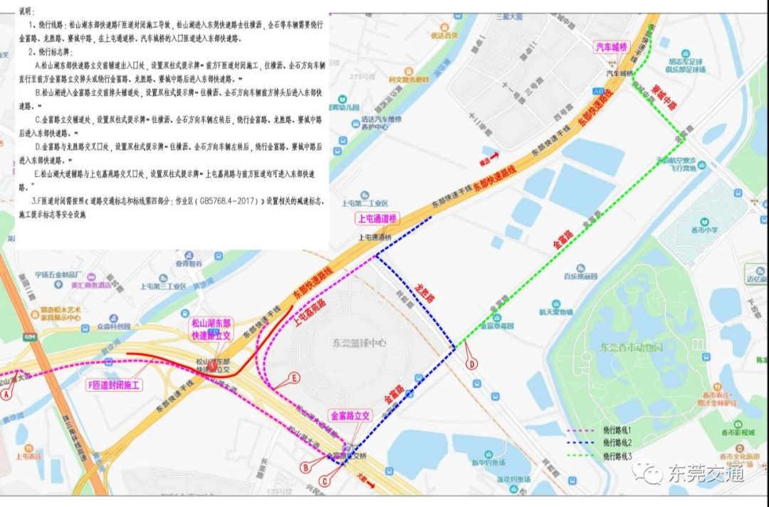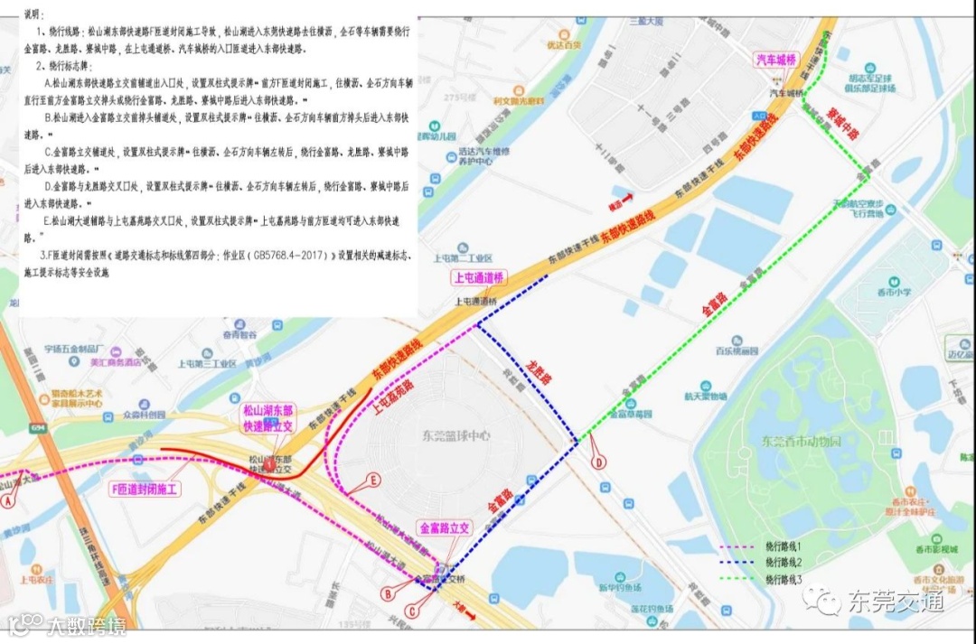 1.松山湖至东部快速路立交前辅道出入口处:前方F匝道封闭施工,往横沥、企石方向车辆直行至前方金富路立交掉头或绕行金富路、龙胜路、寮城中路后进入东部快速路。
