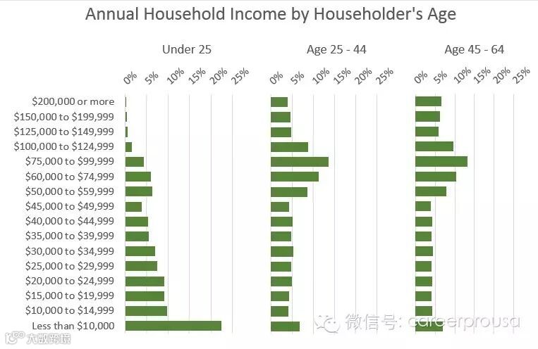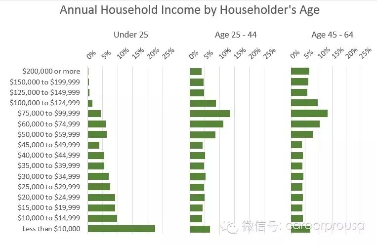 1、年家庭收入情况,平均25岁以下年轻人家庭收入最低,而年龄在25岁至44岁,45岁至64岁家庭收入均较高。