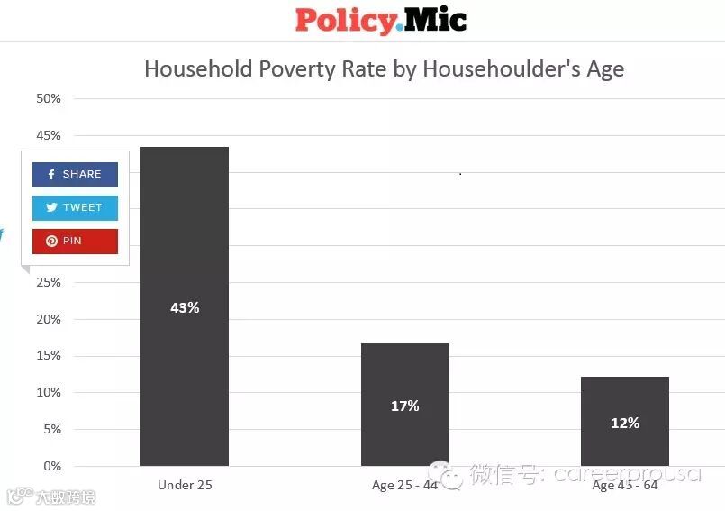 2、25岁以下年轻人贫困率是43%。年轻在25岁至44岁贫困率是17%,年轻在45岁至64岁贫困率是12%。