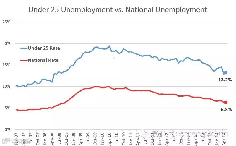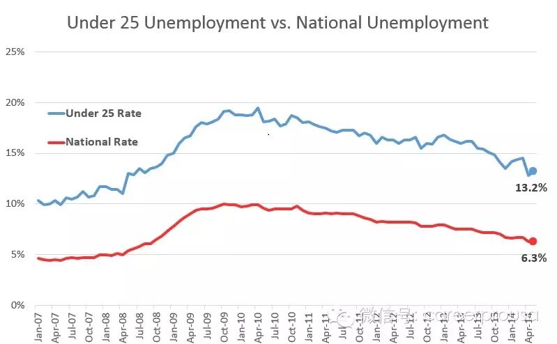 3、25岁以下年轻人失业率高于美国全国平均失业率。