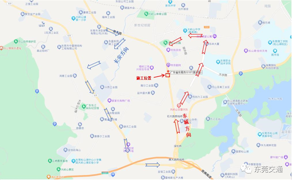 因该道路日常车流量大,施工将会造成一定拥堵,为提高车辆通行效率,保障施工安全,在施工期间,建议途经车辆绕行大岭山大道、厚大路、石大公路、教育路等道路。
