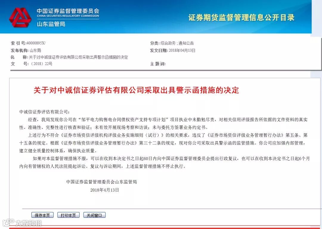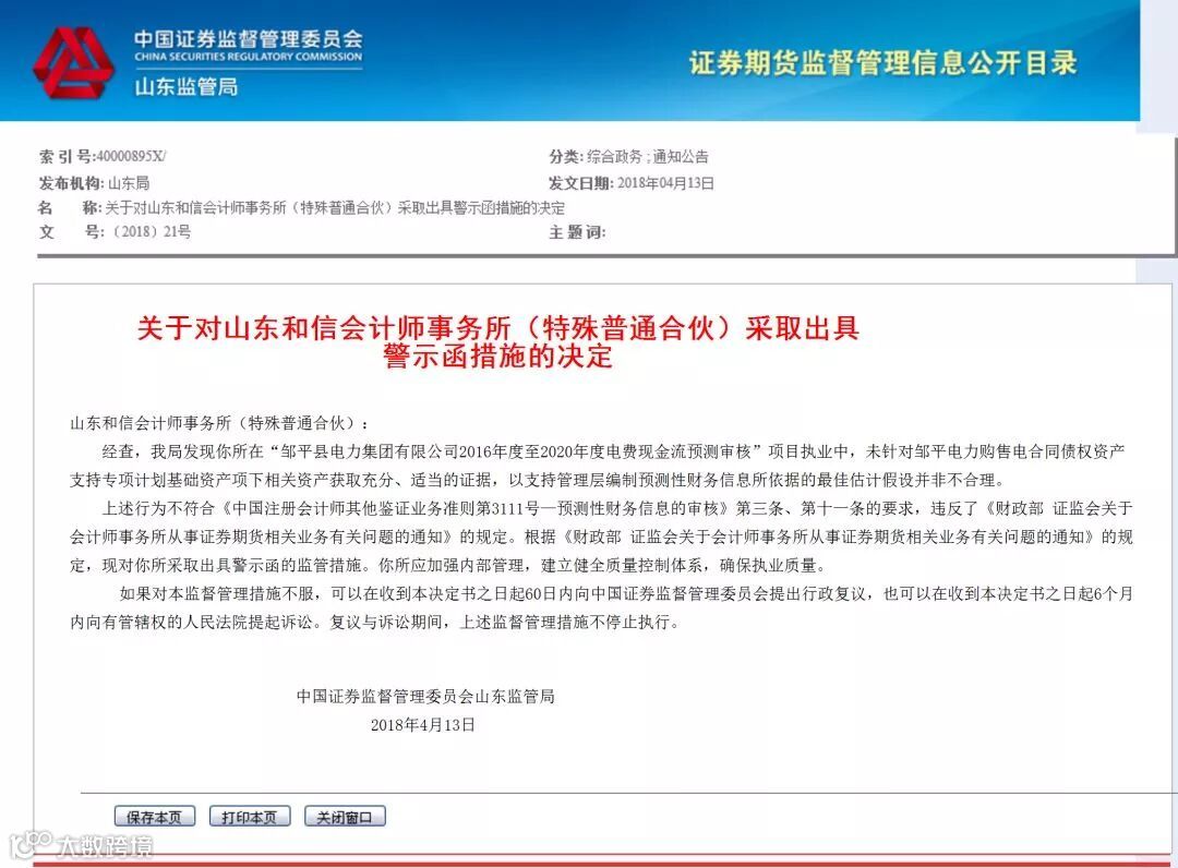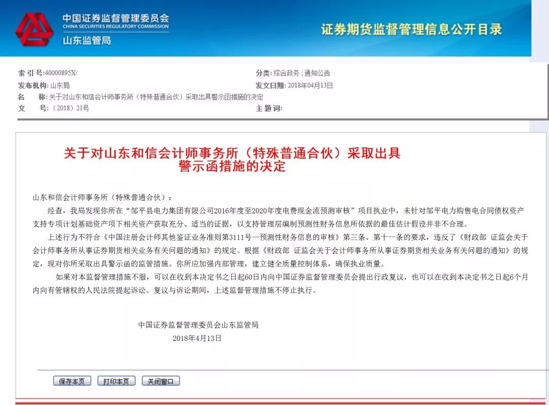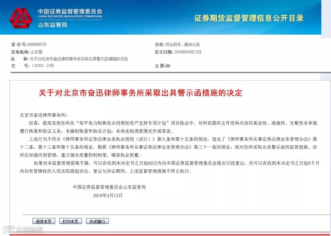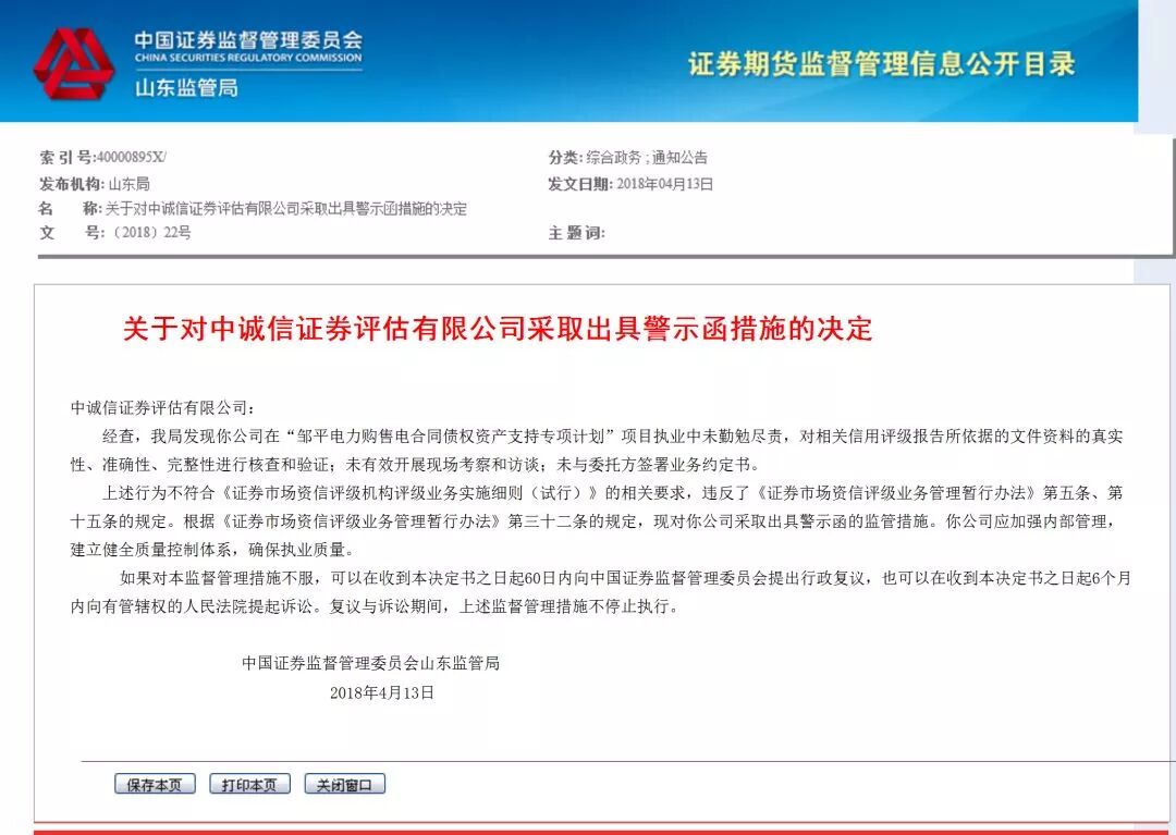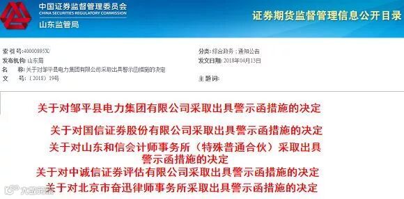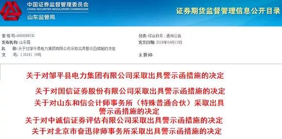 日前,山东证监局连发五张罚单!因邹平电力购售电合同债权资产支持专项计划违规,邹平电力集团、国信证券、和信会计师事务所、中诚信评、奋迅律师事务所被山东证监局出具警示函。