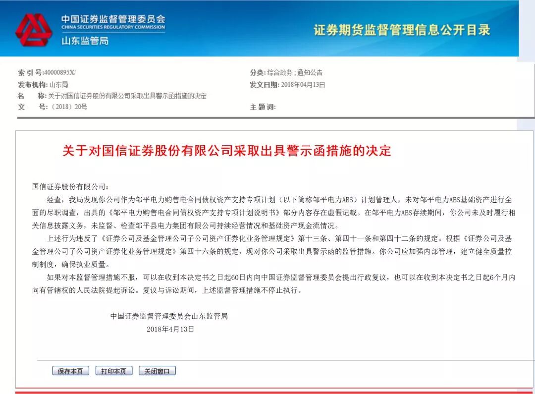 同时,山东证监局还指出,国信证券作为邹平电力购售电合同债权资产支持专项计划(以下简称邹平电力ABS)计划管理人,未对邹平电力ABS基础资产进行全面的尽职调查,出具的《邹平电力购售电合同债权资产支持专项计划说明书》部分内容存在虚假记载。在邹平电力ABS存续期间,国信证券未及时履行相关信息披露义务,未监督、检查邹平县电力集团有限公司持续经营情况和基础资产现金流情况。