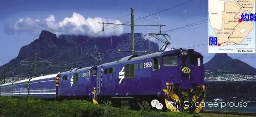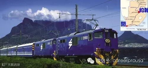 大名鼎鼎的蓝色列车,从南非的开普敦(Cape Town)到达约翰内斯堡(Johannesburg)1,600公里,一趟行车24小时。旺季(夏季)时,一周有三趟;淡季(冬季)时,一周一趟。火车行驶最高时速只会有110公里,缓慢而平稳的行驶,让你有充分的时间沉浸在那如画的风景里。火车上有两种住宿选择∶奢华套房和豪华套房。前者有一个休闲室和浴缸洗手间,后者有一个独立的淋浴间和厕所。每一节车厢仅仅有四个套房。食物和服务都很有水平。你一上车,就有一瓶香槟在你的座位上恭候你。