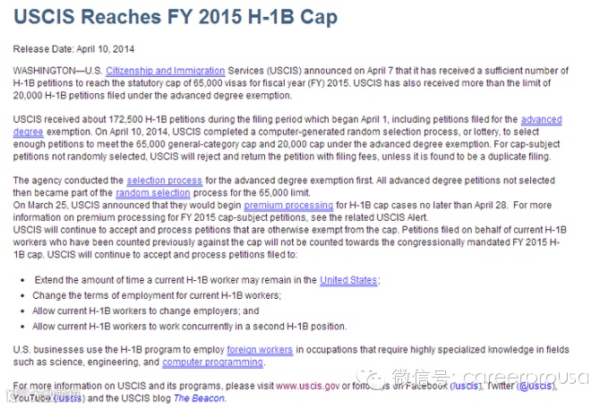 据美国中文网报道,自4月1日开始接受H1B申请以来,移民(微博)局已收到包括高级学位申请在内的17.25万份H1B申请。移民局已于4月10日通过电脑随机抽选选出了6.5万个常规名额和2万个高级学位名额。对于未被抽选中的材料,移民局将在日后连同申请费一起退回给申请人。