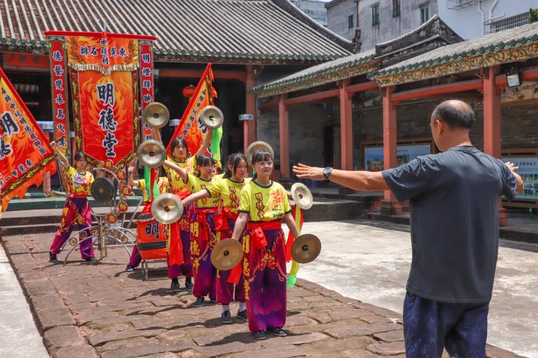 来到石排中坑村王氏大宗祠,听见节奏轻快的鼓点声……原来是明德醒狮团女子乐队正在太阳底下训练。