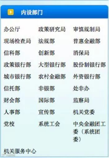 银监会内设部门,体现了按机构监管和按功能监管相结合的思路,设有政策银行部、大型银行部、股份制银行部、城市银行部这类按照机构类型监管的部门;也有普惠金融部、信托部、非银部这类按照业务类型监管的部门。