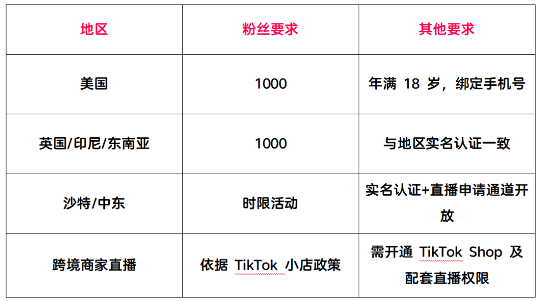 TikTok在不同地区对直播权限的开放设置了不同的门槛,特别是带货型直播,通常需要满足以下条件: