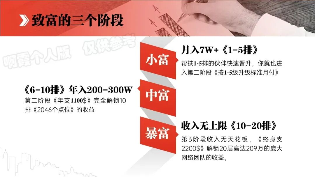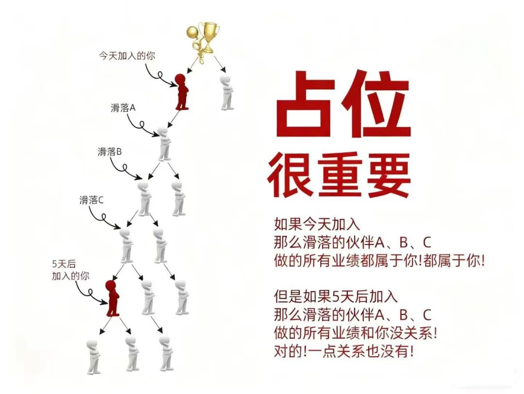 锁定未来收益:您今天加入所占据的位置,将能锁定未来由整个系统发展而滑落至您旗下的所有会员及其创造的业绩。