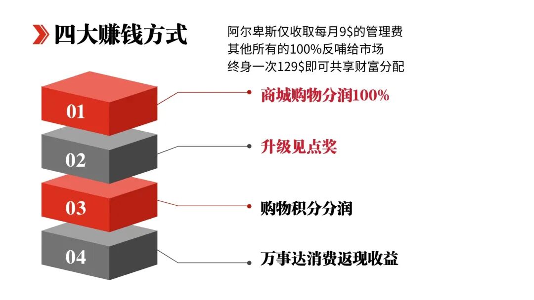 第五:全球唯一一个不靠产品赚差价盈利的平台,阿尔卑斯垮境电商不依靠产品差价盈利,仅收取固定管理费。它将93%的会员费及100%的购物利润全部分配给会员。这种“利他”的分配机制,是其强大吸引力和生命力的核心所在。。
