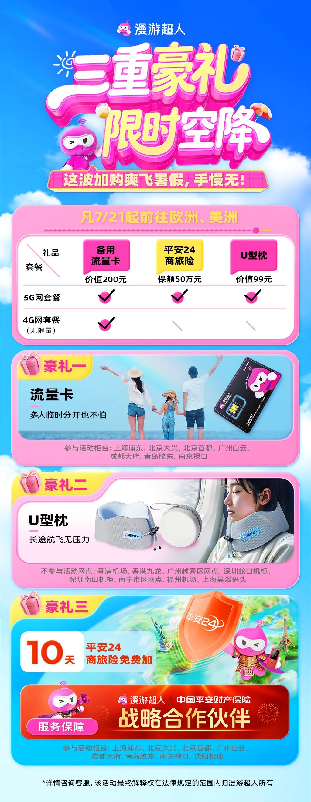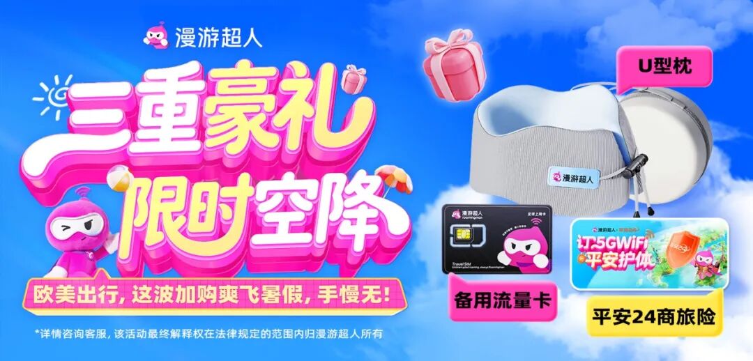 如此丰厚的福利,就是为了让您的欧洲、美洲之行更加完美。赶紧下单预订漫游超人 WiFi,把这些实用好礼带回家,开启无忧旅程。再次提醒,礼品数量有限,先抢先得哦!期待您在旅途中用我们的 WiFi 尽情记录美好瞬间,享受一个超棒的暑期之旅!