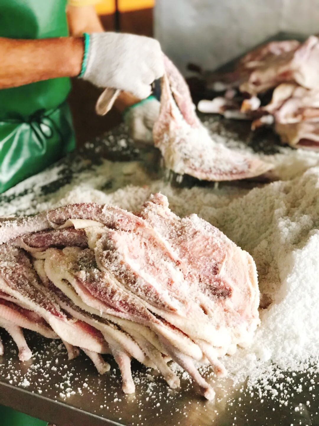 最技巧一步:腌鸭。宰好鸭,开膛洗净后,即可腌制。该步骤主要是用盐来均匀摩擦鸭体的各部位,尤其是上肢和下腿的凹陷处。刷盐叠腌这一技术活水平的高低,直接关系到油鸭质量的优劣。