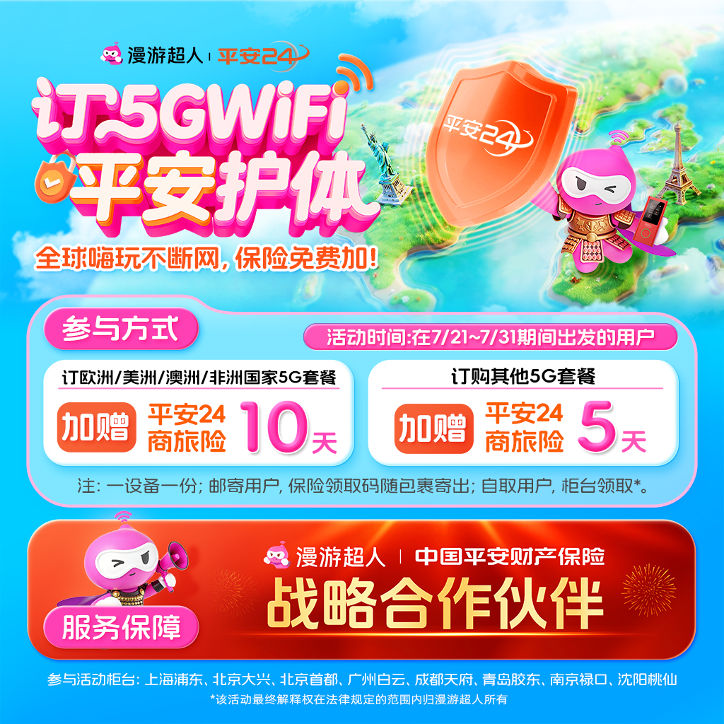 即日起,只要在小程序预订【漫游超人 5G WiFi】,并且在 7 月 21 日至 7 月 31 日期间出发的小伙伴👇