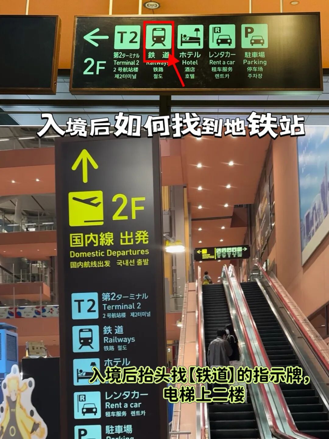 入境后抬头找【铁道】的指示牌,电梯上二楼,看到一个写着2F|E的门出击,过走廊即可到达关西机场的交通枢纽