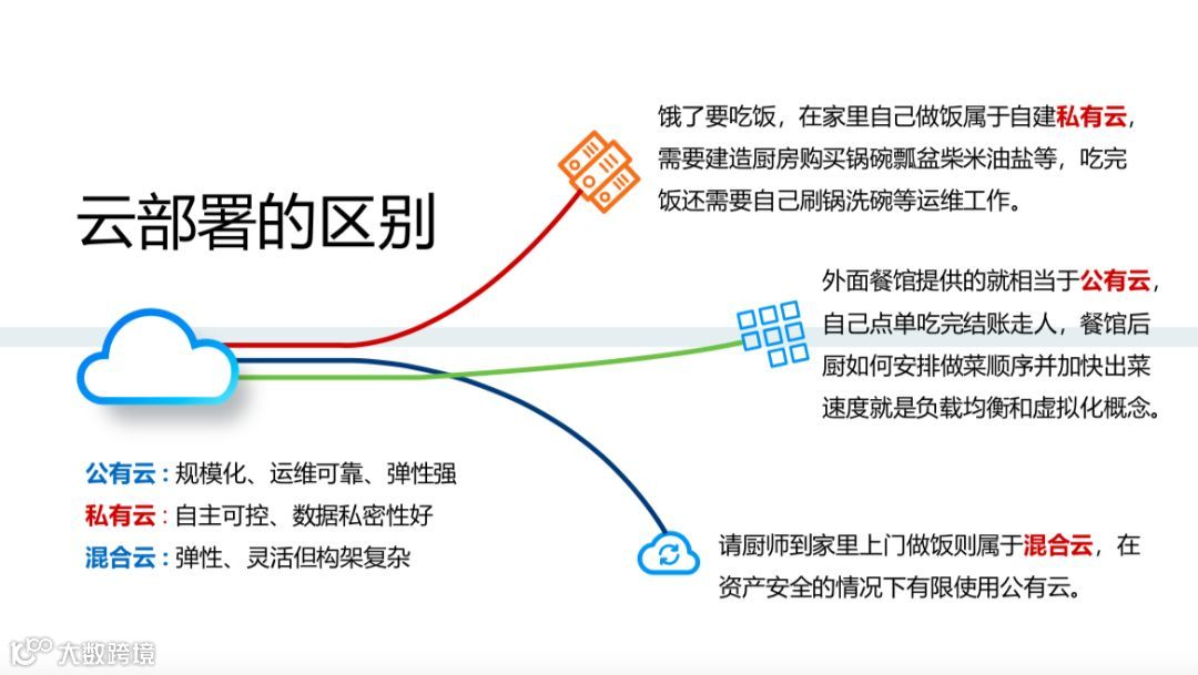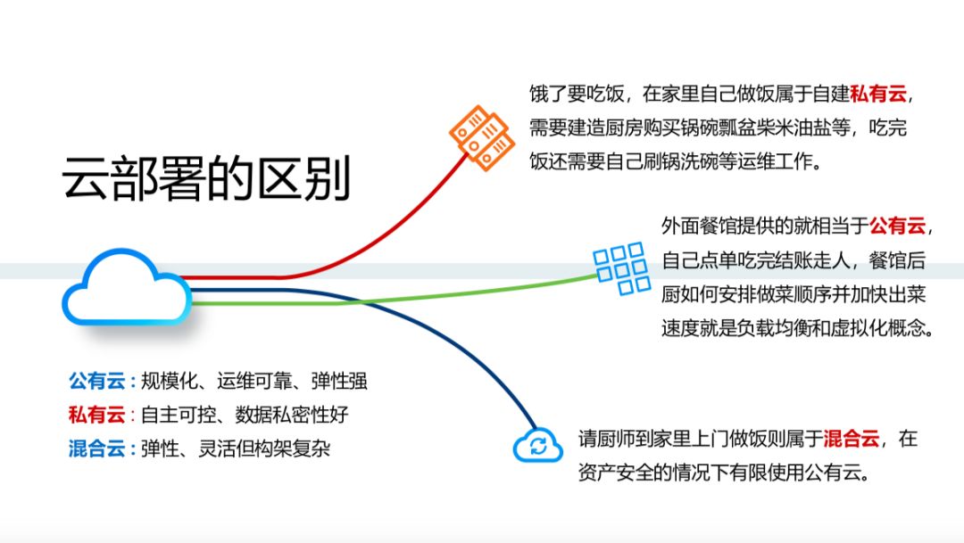 魏老师给大家讲解了公有云、私有云和混合云的直观区别: