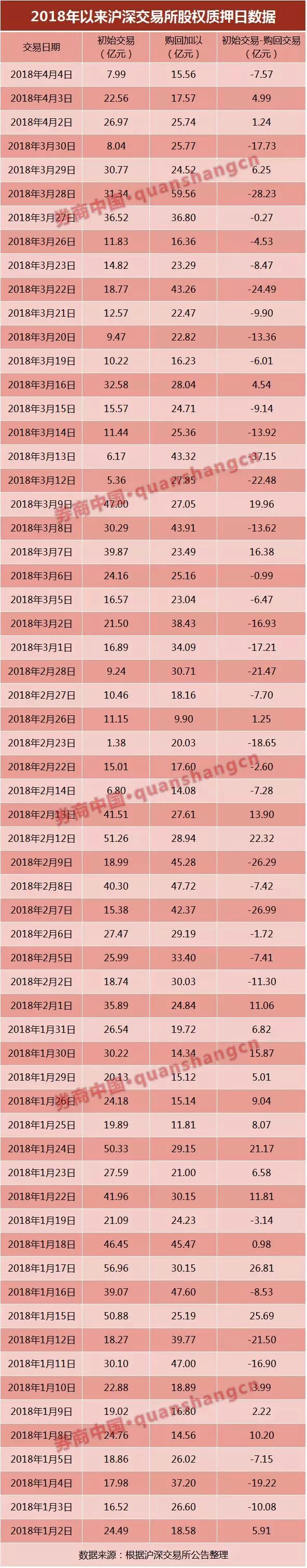 仅就4月已披露数据,4月2日、3日和4日中,质押初始交易金额分别为26.97亿元、22.56亿元和7.99亿元,购回交易分别为25.74亿元、17.57亿元和15.56亿元,二者差额分别为1.24亿元、4.99亿元和-7.57亿元。