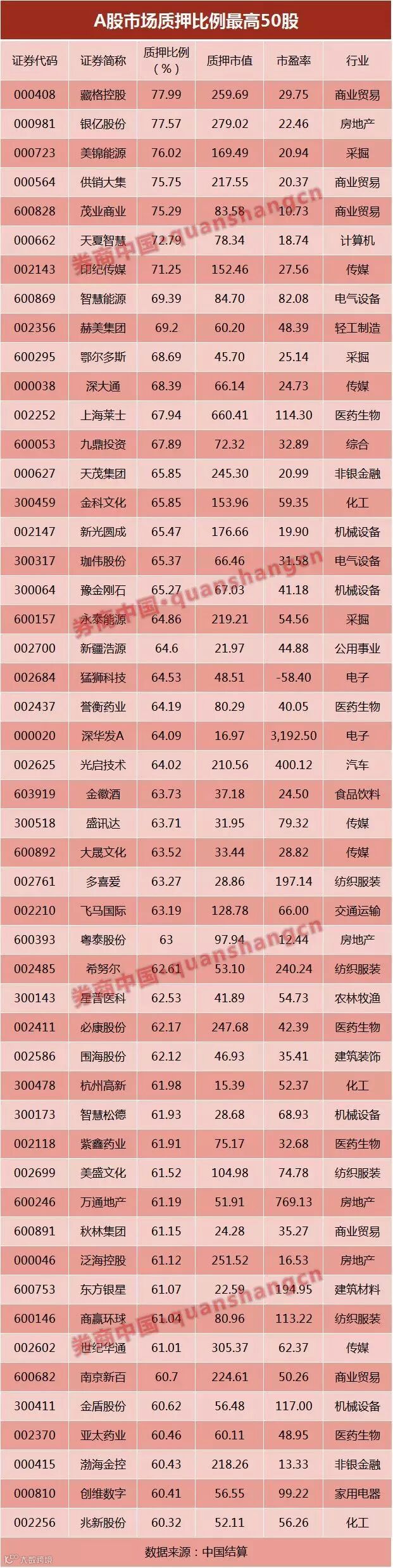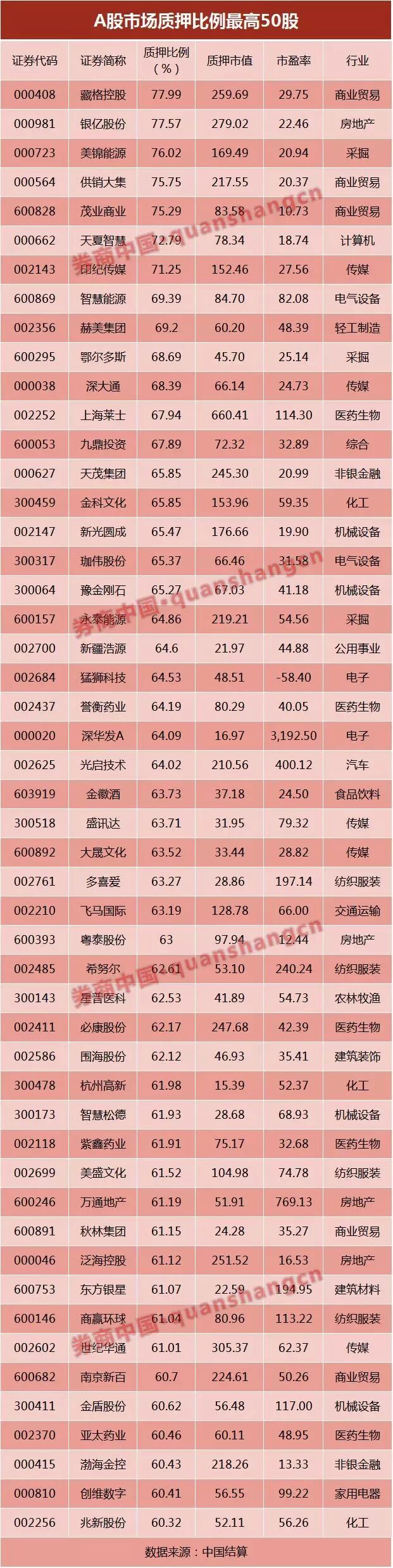 据券商中国记者统计,截至目前,两市共有138股的股权质押比例超过50%,有50股质押比例超过60%,藏格控股、银亿股份、美锦能源、供销大集、茂业商业、天夏智慧和印纪传媒等7股超过70%,这些公司后续都无法再办理新的质押业务。
