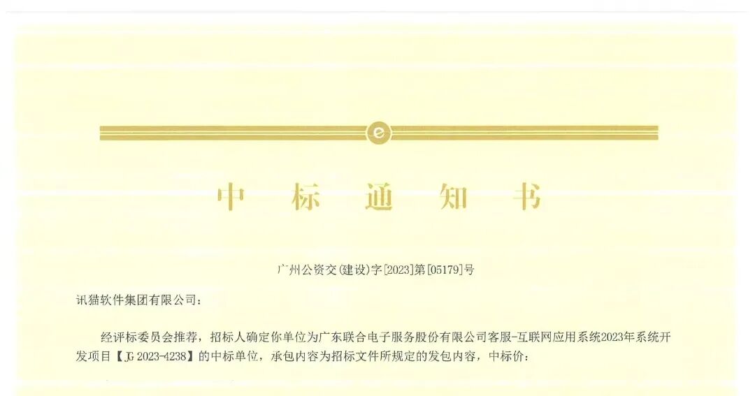 2023年8月28日,在广东联合电子服务股份有限公司客服-互联网应用系统2023年系统开发目招标中,讯猫集团凭借资质优势、专业的软件研发能力、精湛的场景应用技术和突出的业绩以及良好的市场信誉,通过多家单位激烈竞争与专家评选,成功中标。