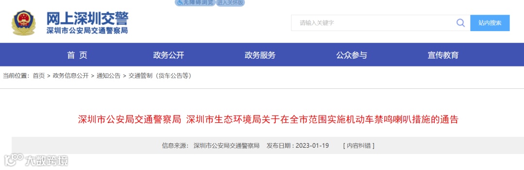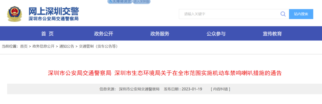 为切实控制交通噪音污染,改善城市交通环境,根据《中华人民共和国噪声污染防治法》第四十九条、《深圳经济特区环境噪声污染防治条例》第六条之规定,决定在全市范围实施机动车禁鸣喇叭的措施,具体内容通告如下: