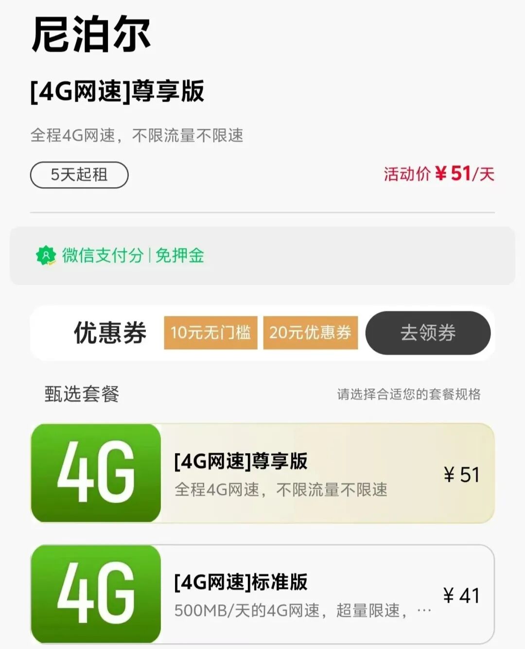 打开【漫游超人小程序】搜索“尼泊尔”,套餐有41元/日和51元/日两款,还有各种优惠券,满减后更便宜。
