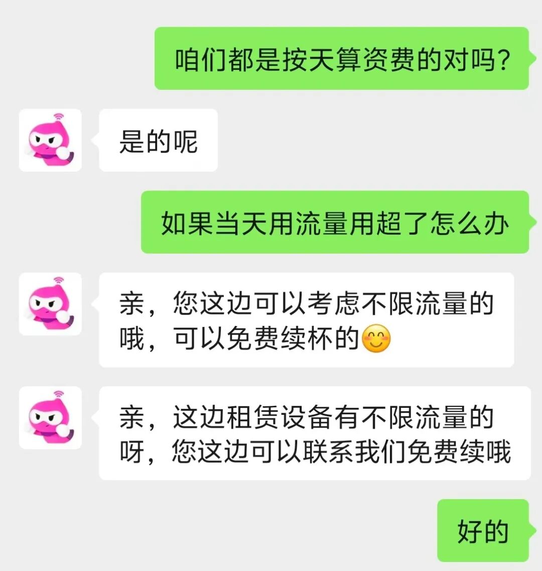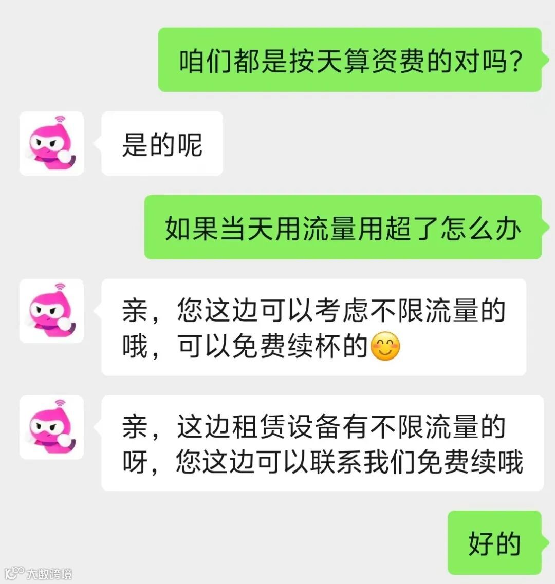 与按流量用量计费的规则不同,我们采用的是“按天计费”的方式,每天流量超够用,并且支持“流量无限续杯”,用完可以联系客服免费续。