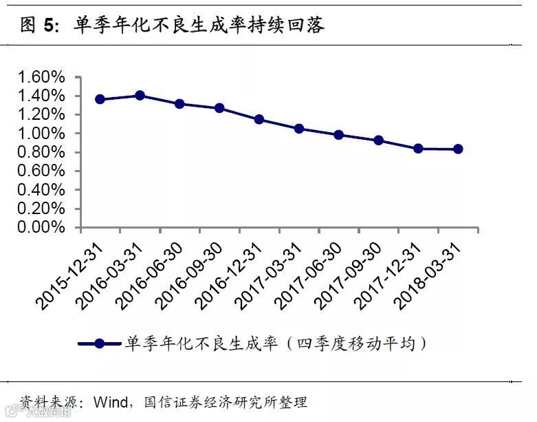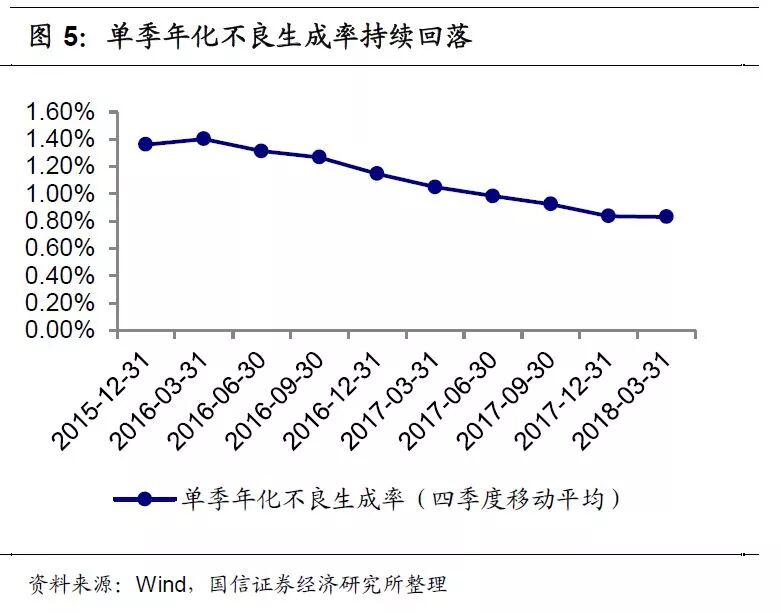 (1)上市银行整体不良贷款率和不良生成率持续回落。其中2018年一季度加回核销转出后的单季年化不良生成率(剔除IFRS9影响)0.77%,较去年同期回落3bps;