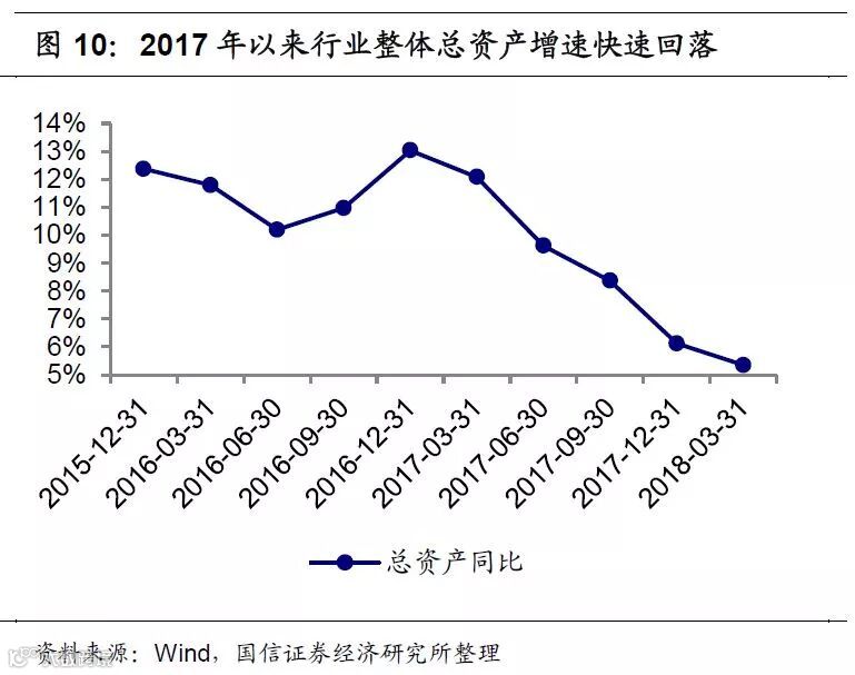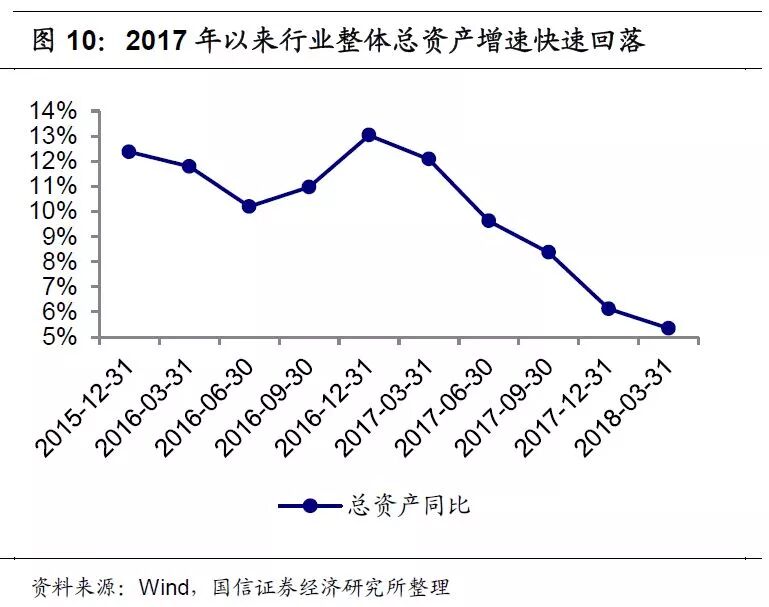 2017年以来,受金融严监管措施影响,银行资产增速快速回落,上市银行整体资产增速在2018年一季末降至5.4%,比2016年末降低了7.6个百分点,也低于2017年末水平。