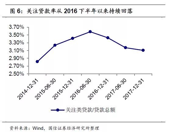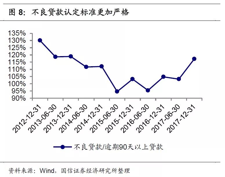 (3) 反映不良认定标准严格程度的“不良贷款/逾期90天以上贷款”在2017年大幅上升了12个百分点至117%,不良认定的严格程度显著提升;