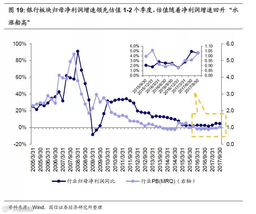 ROE高位见底凸显银行内在价值,净利润增速回升有望带动估值“水涨船高”。2017年我国非金融上市企业的整体ROE约9%,而银行业的ROE超过13%。随着净息差回暖、资产质量改善以及手续费净收入负面影响缓和,行业ROE底部已经能看得见,且底部估值有望保持在12%以上。但银行板块整体PB仅有1倍左右,显然仍处于低估状态。我们认为ROE高位见底将使得银行板块内在价值凸显,未来估值仍有修复空间。从修复路径来讲,我们预计板块估值将跟随净利润增速回升而“水涨船高”。