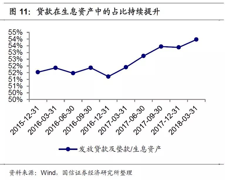 值得注意的是,资产增速的回落伴随着资产端的结构优化:从生息资产结构来看,贷款占比持续提升。从2016年末到2018年一季末,贷款/生息资产提升了2.8个百分点,行业实现“回归本源”。而非标、同业等非信贷资产,在各类监管措施的压力下,余额开始逐步压缩。部分中小银行此前非标等资产占比过高,甚至面临较大的缩表压力,个别银行已出现明显缩表。缩表长期看自然有利于结构优化,但短期内也难免影响营业收入。