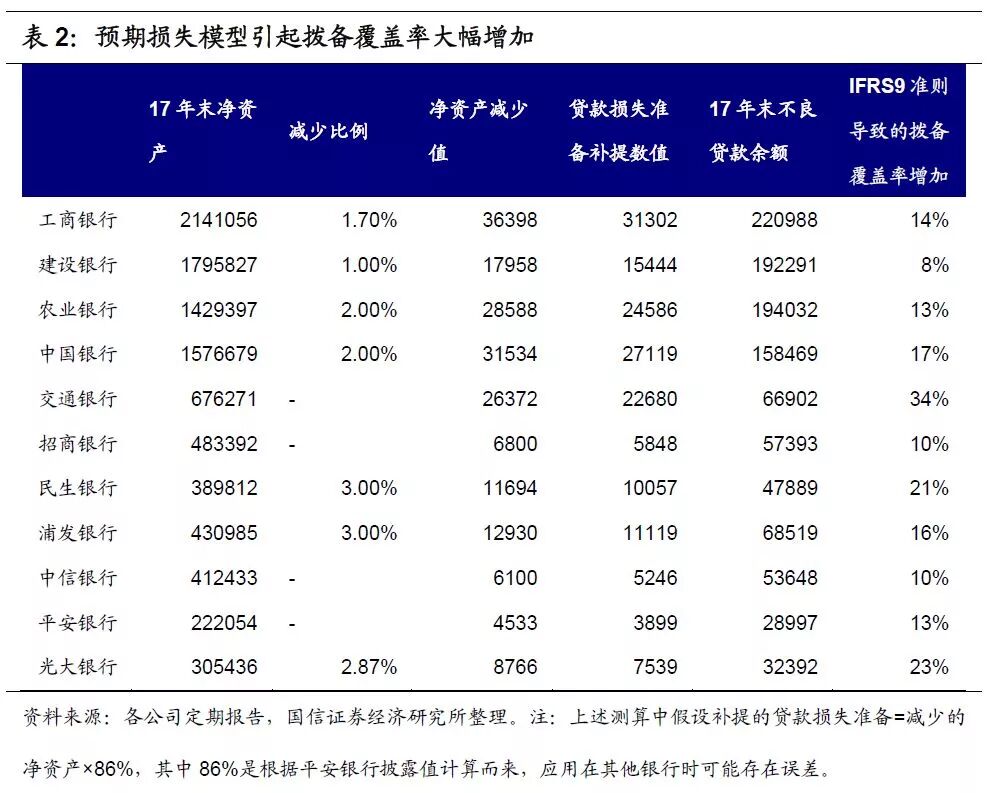 IFRS9采用预期损失模型导致贷款和表外信贷承诺补提拨备,并一次性计入净资产中,这也是净资产变动的最大影响因素。从平安银行数据来看,补提的拨备并非100%扣减净资产,而是会产生税盾效应,即75%抵扣净资产,25%增加递延所得税资产。这一变化会影响推算出的不良生成率,我们在模型中已经做了还原;这一变化也会绕过利润表大幅增加拨备覆盖率,相关影响见下表。
