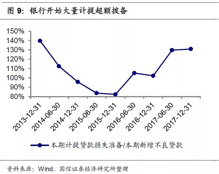 (4)在拨备前利润快速增长且资产质量改善的情况下,部分银行加大了拨备计提力度以平滑净利润增速。2016年以来当期计提拨备/当期新生成不良贷款持续回升,2017年达到131%,反映出银行重新开始大量计提超额拨备。