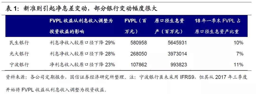 IFRS9对金融工具进行了重分类,将金融工具从交易性金融资产、可供出售金融资产、持有至到期投资、应收款项类投资四类变为三类:以公允价值计量且其变动计入当期损益的金融资产(FVPL)、以公允价值计量且其变动计入其他综合收益的金融资产(FVOCI)、以摊余成本计量的金融资产。前述调整对资产负债表的影响已为市场熟知,但实际上,这一调整不仅影响了资产负债表,还影响了利润表。根据新准则,FVPL的利息收入算作投资收益,这一调整导致银行利息收入减少,投资收益增加。那些FVPL持有量较大的银行,净息差就会变得非常低,但投资收益会变得很多,从而反映出其交易型银行的特征,比如民生银行、光大银行和宁波银行。为保持净息差可比,我们将会计准则变化银行的FVPL从生息资产中剔除。考虑到新准则下银行的FVPL大幅增加,测算过程中我们假设一季度FVPL平均余额为期末值。