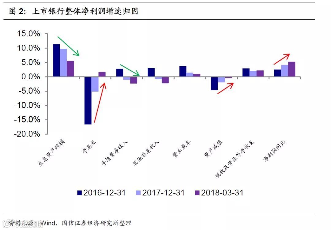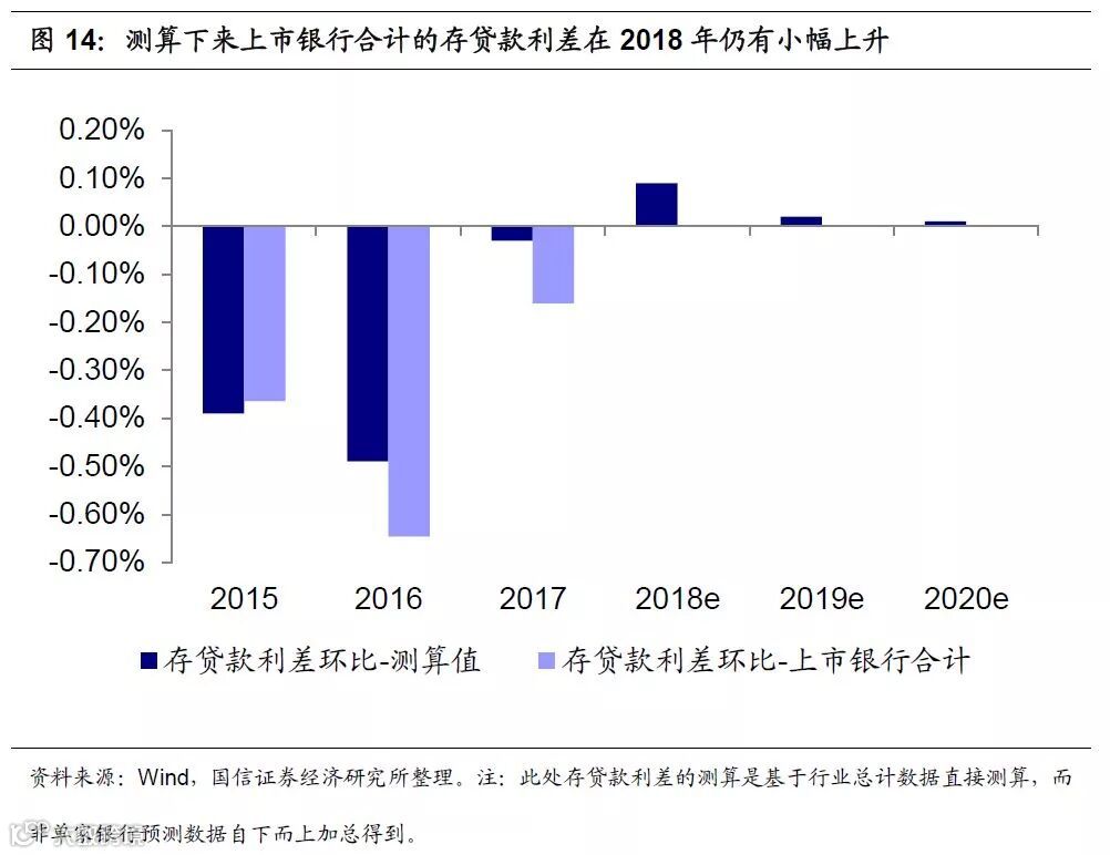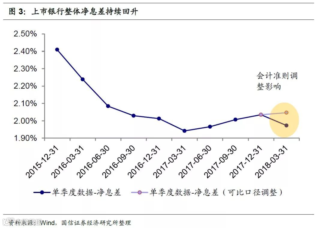 可比口径调整后2018年一季度净息差继续回升。2018年一季度用期初期末平均余额算出的上市银行整体净息差下降较多,但并非真的回落,而是部分银行会计准则调整,导致一季度净息差与历史不可比。口径还原之后,一季度单季净息差环比约上升1bp至2.04%(相关会计准则调整的影响及还原算法请见附录),继续小幅上升,符合我们前期预期。