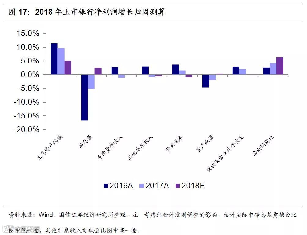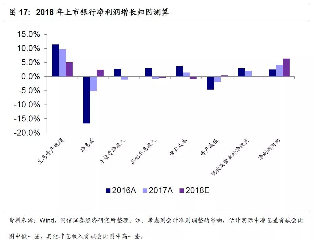 (2)重定价叠加信贷议价能力增强,净息差同比回升。净息差的测算难度比较大,主要是因为非存贷款业务的利率与市场利率相关,波动很大,引起较大误差。但是从历史数据来看,由于存贷款业务仍然是主体,净息差变动方向跟存贷款利差基本一致,未来业务回归本源之后将更趋一致。在未来基准利率维持不变的假设下,测算2018年存贷款利差较2017年走阔。此外,受到严监管影响,银行信贷业务议价能力增强,2018年存贷款利差改善幅度或超过测算值。净息差回升将对净利润的同比增长带来较大正面贡献;