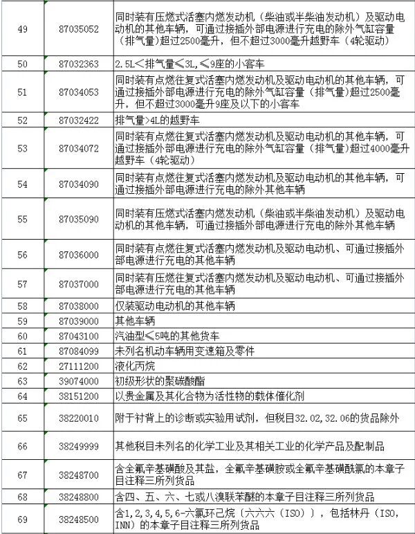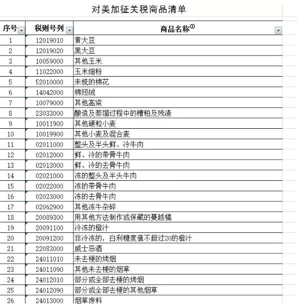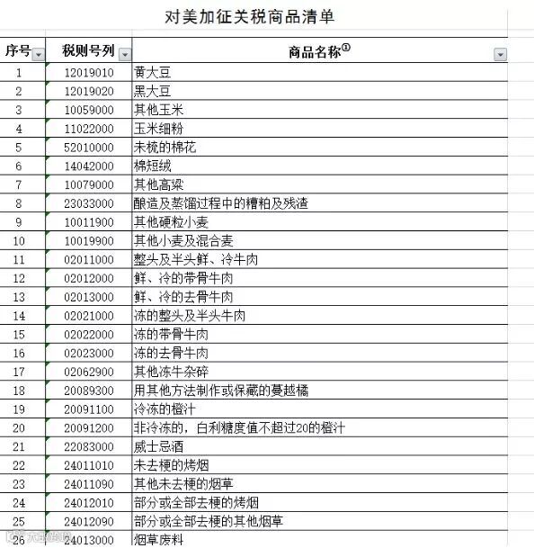 根据我方在世界贸易组织项下的权利和义务,以及《中华人民共和国对外贸易法》和《中华人民共和国进出口关税条例》相关规定,经国务院批准,国务院关税税则委员会决定对原产于美国的大豆、汽车、化工品等14类106项商品加征25%的关税。